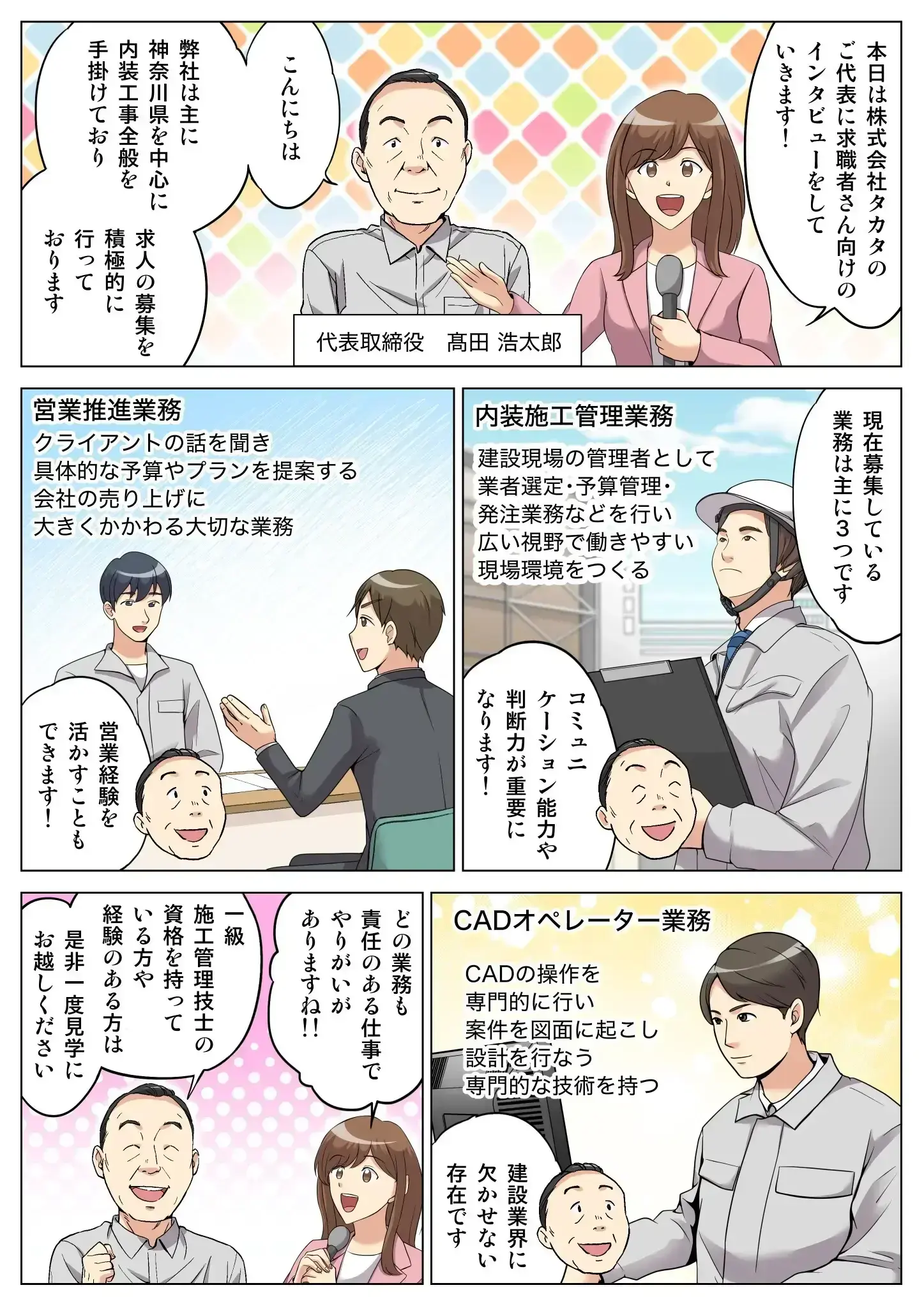 タカタでは建物の内装工事・造作工事を手掛けております。内装工事と言っても、建物の種類や用途によって施工内容は様々です。見えない部分でも手を抜かず、丁寧で完璧な工事を行なうのが弊社の強みです。ハイレベルな環境で働きたい方は、ぜひご応募ください。