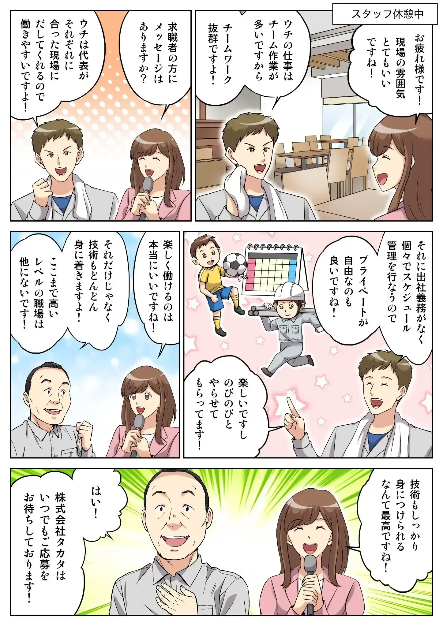 困ったことがあればいつでも相談できるベテランスタッフが、弊社には多数在籍しています。また、代表が一人ひとりを見て適した現場に出しているので、自分に合った現場でのびのびと成長できます。仕事とプライベートでメリハリをつけて働いていきたいという方にもおすすめです。